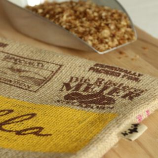 Somit wurde auch das eigentliche Abfallprodukt, das bei der Kaffeeröstung entsteht – neben dem verwendeten Kaffeesack – mit in den Herstellungsprozess einbezogen und findet als Upcycling in den Kissenhüllen eine sinnvolle Verwendung.
